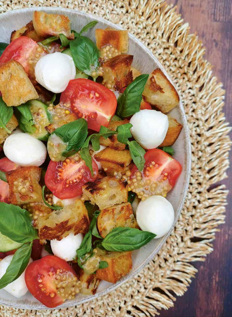 • Gemüse mit Mozzarella mischen, einige Blätter Basilikum darüberstreuen, die gerösteten Brotwürfel dazugeben und mit dem Dressing begießen.