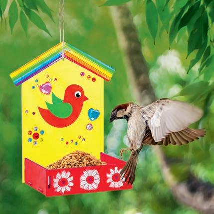 4 DIY-Vogelfutterhaus 2 Stk. Die Vogelhäuser können ganz einfach in 4 Schritten zusammengesetzt wer den. Danach können die jungen Ba stelfans die Vogelhäuser bemalen und hierbei ihrer Fantasie und Kreativität freien Lauf lassen. Hierzu eignen sich besonders unsere Bastelfarben von Velazquez, sowie Glittersteine, Sticker usw. Ein ideales Geschenk für Götti, Gotti, Tante usw. Lieferung: Bausatz