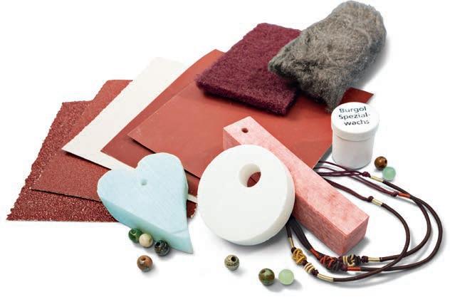 Schmucksteinanhängern, 3 Halsbän der, 3 Halbedelsteinkugeln, 5 Schleif papier Stärken, Schleifvlies, Stahlwolle und Politur sowie komplette Anlei tung.