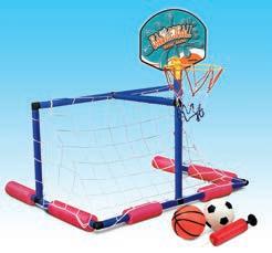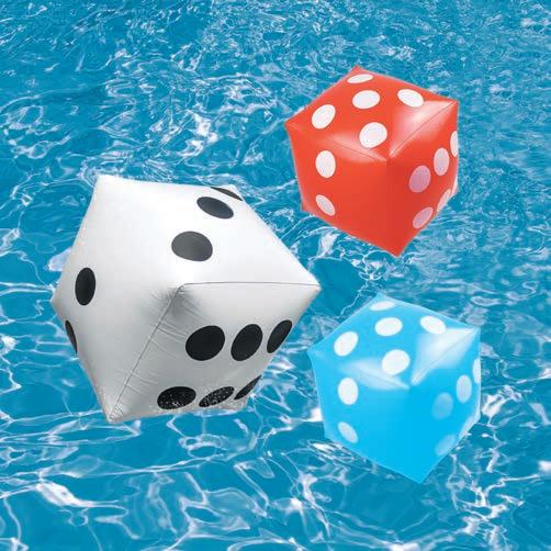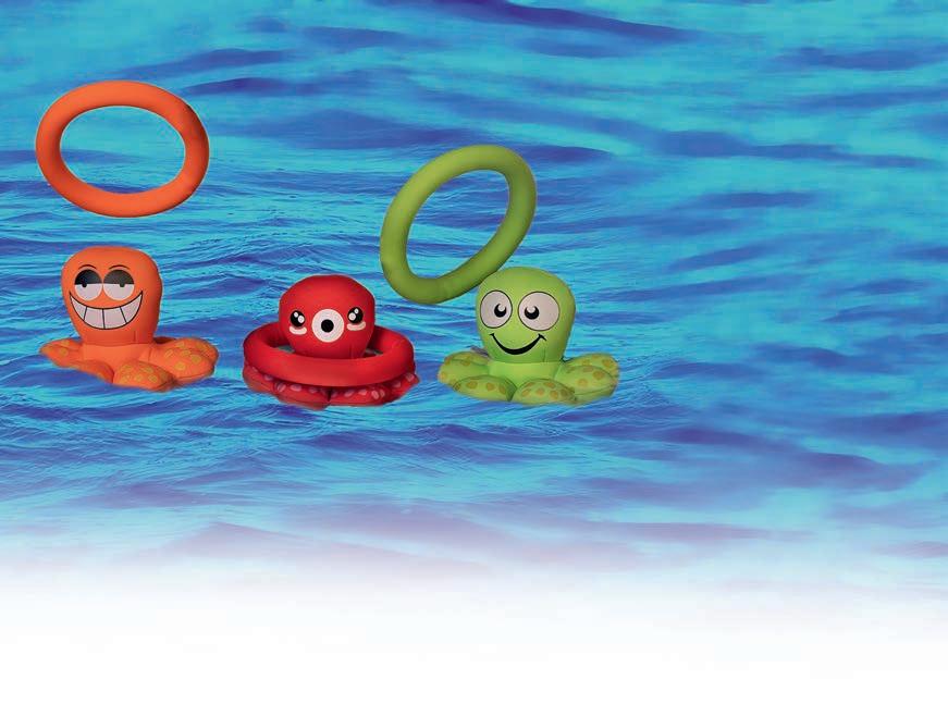 1 Grands dés gonflables, 3 pces Ces dés gonflables aux multiples usages permettent de s’amuser dans la piscine comme sur la pelouse. Avec eux, il est impossible de s’ennuyer! Livraison : 3 dés (rouge, bleu et blanc), taille 30 x 30 cm. Dès 3 ans. No de comm. 14180 100 points BEA + CHF 14.80 (sans points CHF 21.—) 2 Jeu de water-polo 2 en 1 Grands et petits comme des fous avec ce lot de jeux aquatiques pour des tournois de basket ou de water-polo. Cadres en plastique avec flotteurs et filets. Deux balles l 7 cm et pompe inclues dans la livraison. Dimensions buts env. 79 x 59 cm, hauteur totale 78,5 cm. No de comm. 12919 300 points BEA + CHF 19.80 (sans points CHF 27.—) 3 Anneau de jeu pieuvre Dans la mer, le lac ou la piscine familiale, ils procurent le même plaisir aux enfants. Les „copains” gonflables éclairent toujours le visage de chaque enfant d’un grand sourire. Des poignées stables leur assurent une bonne