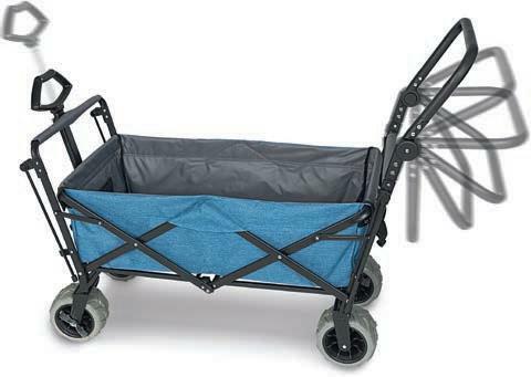 moderne 600D extra-résistant, roues de 17,5 x 10 cm en PP et EVA, deux barres de tractions à longueur variable (53-82 cm) et pare-chocs. Livrée avec une housse de protection. Taille : environ 90 x 43 x 56 cm. Charge max 80 kg. No de comm. 13269 500 points BEA + CHF138.— 3 Chariot à main City Line Chariot à main ultra compact, avec une entrée latérale confortable et des sièges ; un compagnon idéal en ville, pour les courses, etc. Chariot à main robuste et pliable avec une grande surface de chargement et des porte-boissons. S’ouvre et se replie en un tournemain grâce au système accordéon. Châssis en acier avec revêtement textile lavable en 300D PA, roues 75 x 30 mm, tige de traction télescopique, hauteur 100 cm. Dimension ouvert env. 92 x 56 x 98 cm, fermé env. 70,5 x 56 x 17 cm, poids 8,6 kg, poids de chargement 70 kg. No de comm. 13662 500 points BEA + CHF 74.—