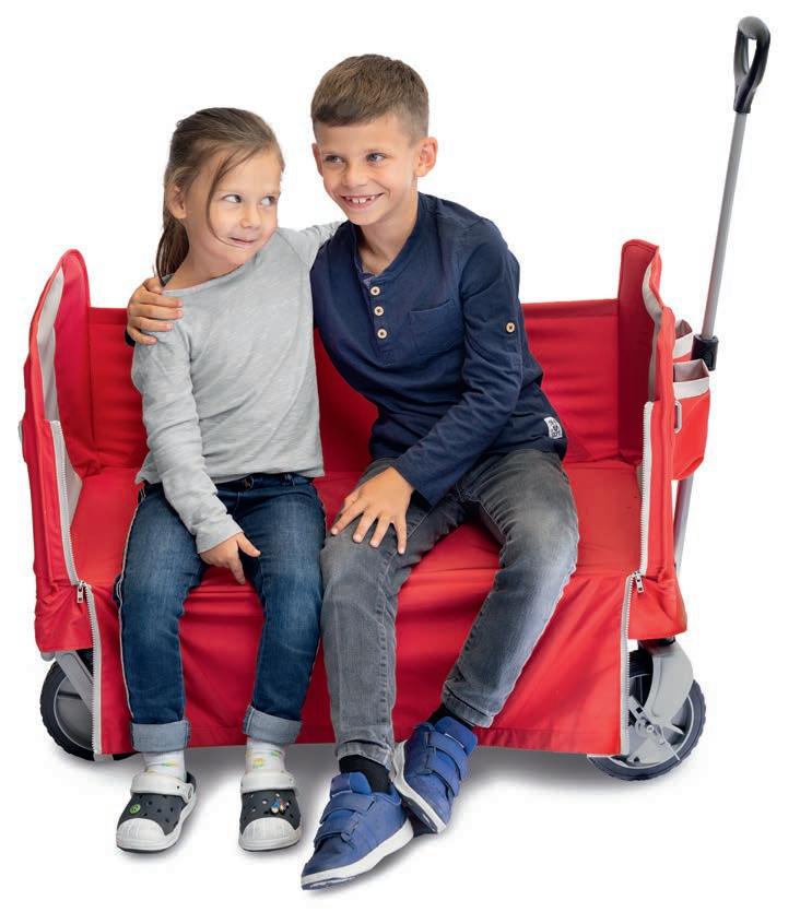1 Voiturette pour famille La voiturette à bras de BEA Toys, pour transporter des bagages, lors des randonnées ou comme chariot de restauration pour les excursions en famille. La voiturette familiale la plus populaire, avec de la place pour 2 ou 3 enfants. Avec connecteur en caoutchouc pour plus de confort. Charge max 150 kg. Surface de chargement: 86 x 37 x 28 cm. No de comm. 1290 1000 BEA-Punkte + CHF 99.— 2 Set de transformation en char bâché Vous pourrez facilement transformer votre chariot familial (art. n° 1290) en char bâché. Y compris le rabat d'accès à l’arrière. No de comm. 1542 200 points BEA + CHF 48.–