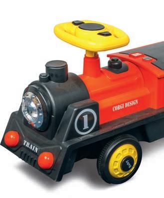 3 Voiture porteuse locomotive Avec ce chouette véhicule en forme de locomotive avec remorque et un espace de rangement pour leurs jouets préférés, 2 enfants peuvent s’amuser ensemble à l'intérieur ou à l'extérieur (sur un terrain plat). Le feu avant et le feu clignotant coloré sur le côté s’allument et s’éteignent à l'aide des boutons placés sur le volant et la remorque. Le train-siège pour enfants a une longueur totale d'environ 115 cm. Largeur des sièges avant/arrière environ 24 cm / environ 21 cm. Dès 3 ans. No de comm. 13918 300 points BEA + CHF 64.—