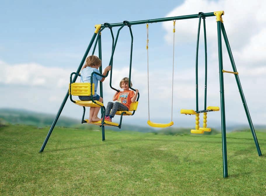 1 Balançoire Un jeu classique toujours dans le vent, avec un nouveau design. Construction robuste et durable en tube d’acier l 2,5 cm avec deux sièges tout confort en plastique et un «sac en tissu» au milieu pour ton jouet préféré. Dimensions env. 140 x 39 x 54 cm, pour les enfants entre 3 et 10 env., charge max. de 70 kg au total. No de comm. 12497 500 points BEA + CHF 98.—