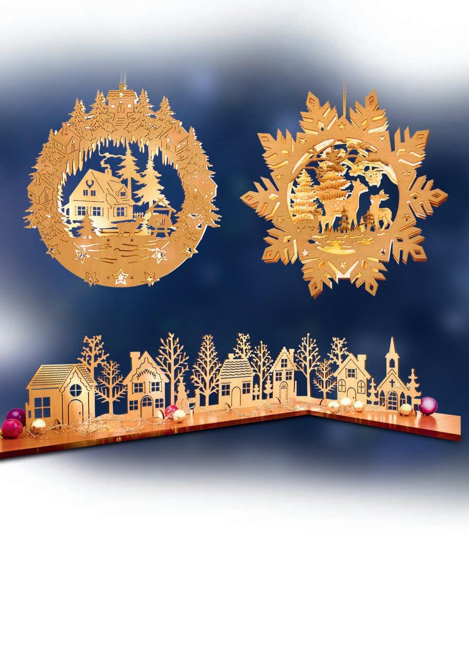 3 Weihnachtskulisse 3tlg. Zauberhaft verträumte und weihnacht liche Fensterkulisse für eine stim mungsvolle Atmosphäre im Wohnzim mer. Aus liebevoll verarbeitetem Schichtholz. Einfach nach Belieben auf Fenstersims, Kommode oder Tisch ar rangieren und mit kleinen Teelichtern