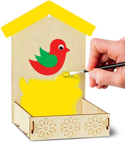 4 DIY-Vogelfutterhaus 2 Stk. Die Vogelhäuser können ganz einfach in 4 Schritten zusammengesetzt wer den. Danach können die jungen Ba stelfans die Vogelhäuser bemalen und hierbei ihrer Fantasie und Kreativität freien Lauf lassen. Hierzu eignen sich besonders unsere Bastelfarben von Velazquez, sowie Glittersteine, Sticker usw. Ein ideales Geschenk für Götti, Gotti, Tante usw. Lieferung: Bausatz