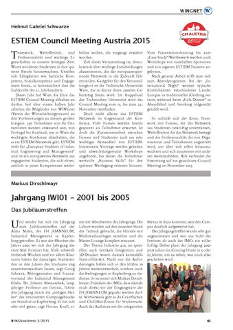eamwork, Weltoffenheit, und Professionalität sind wichtige Eigenschaften in unserer heutigen Zeit. Worte mit denen Studenten in ihre späteren Berufe hineinwachsen. Gesellen sich Fähigkeiten wie fachliche Kompetenz, Sozialkompetenz und Engagement hinzu, so kennzeichnet dies die Fachkräfte des 21. Jahrhunderts. Dieses Jahr hat Wien die Ehre das ESTIEM Council Meeting abhalten zu dürfen. Seit über einem halben Jahr arbeiten die Mitglieder von WINGnet (Verein der Wirtschaftsingenieure) an den Vorbereitungen zu diesem großen Ereignis. 350 Teilnehmer von 80 Universitäten werden anwesend sein, von Portugal bis Russland, um in Wien die wichtigste Konferenz abzuhalten, die es im ESTIEM-Netzwerk gibt. ESTIEM steht für „European Students of Industrial Engineering and Management“ und ist ein europaweites Netzwerk aus engagierten Studenten, die sich ehrenamtlich in jenen Kompetenzen weiter-