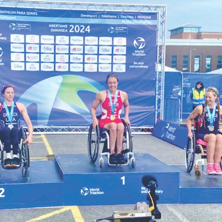 The para-triathlon consists of a 750m open water swim, a 20 km hand bike ride, and a 5 km run using a three-wheeled racing chair. Leanne has competed in numerous international events, including races in Japan, Wales, Madeira, France, Spain, Abu Dhabi, and the USA