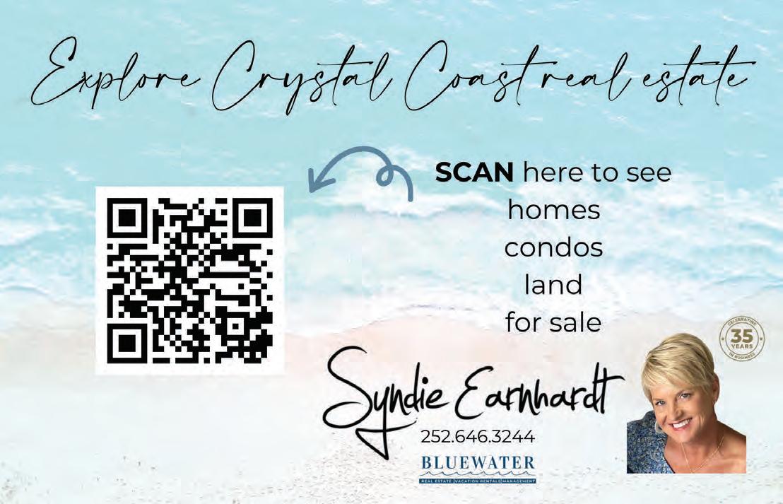 Bluewater Real Estate: 200 Mangrove Drive, Emerald Isle, 252-354-2128; 407 Atlantic Beach Causeway Suite #6F, Atlantic Beach 252-7263105; bluewaternc.com. Vacation, monthly & annual rentals. Real estate sales of island & mainland properties for all of Carteret County. Carolyn Blackmon: Broker/realtor with Bluewater Real Estate, Emerald Isle. A Carteret County native ready to assist newcomers and locals alike when buying and selling real estate along the Crystal Coast. Call 252-515-4831 or visit www. bluewaternc.com.