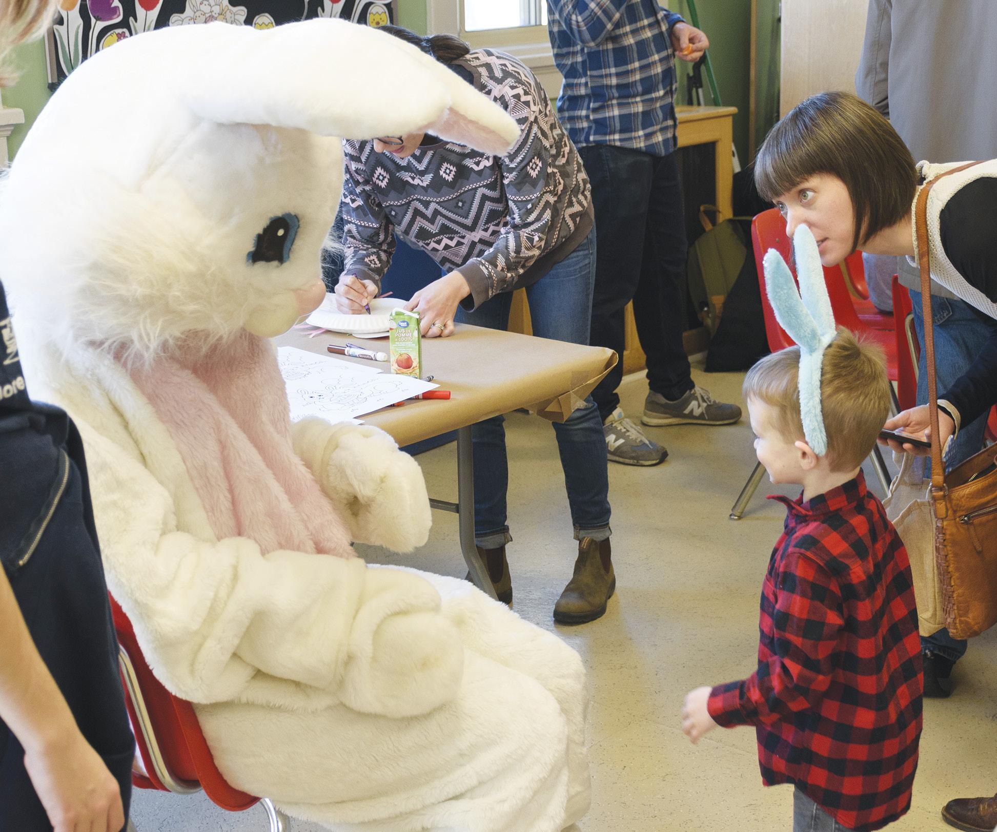 A youngster meets with the Easter Bunny during Community Centre 55’s Breakfast with the Easter Bunny and Egg Hunt last Saturday morning. Local residents are reminded that the annual Toronto Beaches Lions Easter Parade takes place on Sunday, April 9, along Queen Street East starting at 2 p.m.