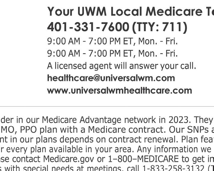 Page ......... e Reminder November 22-28, 2022 For E ective Advertising Call 821-2216 2 2435 Nooseneck Hill Road, Ste. A-1, Coventry, RI 618 Toll Gate Road, Warwick, RI Dr. Matthew Willett MD, FAAD Rebbecca Shea MSPAS, PA-C Marissa Cunetta, PA-C Dr. Jason Michaels MD, FAAD, Mohs Surgeon AspireDermatology.com Call 401.239.1800 Accepting Same Day Requests Providing Surgical, Medical & Cosmetic Dermatology ACCEPTING NEW PATIENTS Shop.AspireDermatology.com RAKE IN THE SAVINGS WITH OUR CD SPECIAL! LIMITED TIME OFFER Visit www.cranstonmecu.org or call 401-463-3010 for more information. 2.25% APY* 12-MONTH CERTIFICATE 3.25% APY* 30-MONTH CERTIFICATE heat your home for less 401-475-9955 www.GlowOil.com Everyday Low Prices on Heating Oil and Service Repair Review Your Medicare Plan for 2023 Medical Vision OTC Dental Hearing Aids Gym Membership We do not offer every plan available in your area. Any information we provide is limited to those plans we do offer in your area. Please contact Medicare.gov or 1-800-MEDICARE to get information on all of your options. Meet with a local agent at 30 Quaker Lane • Warwick, RI (Across the Hall from Social Security) Representatives are Member Agents of WeCanHelpYou.Org • A 501(c)(3) non-profit organization providing complimentary Medicare education and enrollment services Plans Starting at $0 Premium Call Today (401) 210-8100 Same-Day Pickup! Call or schedule before 10:00 AM ✓ Self Service Laundromat ✓ Professional Dry Cleaning ✓ Same Day Wash, Dry & Fold ✓ Pick-Up & Delivery Schedule Your Same-Day Pickup Online! 560 Providence St., West Warwick • 401-826-7158 www.thorpeslaundry.com Sat 6:30 AM - 9PM; Sun 6:30 AM - 8PM Family Owned and Operated for 21+ Years