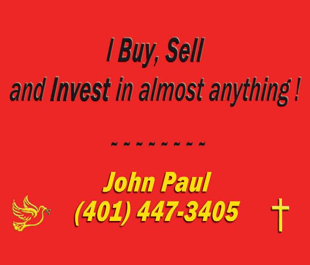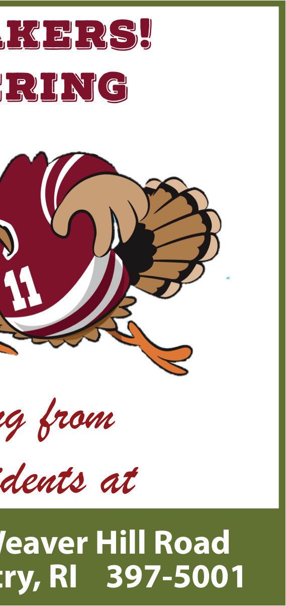 FREE CONSULTATIONS 1500 Nooseneck Hill Rd., Coventry, RI 02816 Phone (401)823-9200 • Fax (401)823-9278 Visit Our Website at www.itwlaw.com Email Your Photos to dawnd@rhodybeat.com Include both your and your pet’s name and tell us what makes them so special! Please make sure your photos are in focus. Blurry photos cannot be reproduced. “ LUNA” This is Luna! Our 2 year-old Tortoiseshell cat from West Warwick. She is special because she brought joy and love into our hearts. She is the prettiest cat we have ever seen. We’re so glad she is our fur baby. Happy Companion of Jada and Alexis Fitzgerald Email Your Photos to dawnd@rhodybeat.com Include both your and your pet’s name and tell us what makes them so special! Please make sure your photos are in focus. Blurry photos cannot be reproduced. “ CODY ” This is Cody, he is a very loving pup who loves long walks, squeaky toys, and eating treats. Happy Companion of Hannah The tree located at customer service has stars with a senior’s first name, gift request and size A program coordinated by Seniors Rule to obtain gifts for seniors in facilities across RI who may not receive a gift for the Holidays Pick a star, purchase the gift, and return it to customer service with an appropriately sized gift bag. Elves for Elders Nov 1 Dec 11 Warwick Mall | 400 Bald Hill Rd. Warwick RI AUTO REPAIR BUSINESS FOR SALE Well established local area repair business with a loyal customer base is becoming available due to planned retirement. The current owner will work with the buyer to assist in the transition of the business to the new owner. This is an excellent opportunity for a qualified technician to own an already successfully operating enterprise. For more information please call 978-402-5772 Prepare for power outages today WITH A HOME STANDBY GENERATOR *To qualify, consumers must request a quote, purchase, install and activate the generator with a participating dealer. Call for a full list of terms and conditions. REQUEST A FREE QUOTE CALL NOW BEFORE THE NEXT POWER OUTAGE (866) 643-0438 $0 MONEY DOWN + LOW MONTHLY PAYMENT OPTIONS Contact a Generac dealer for full terms and conditions FREE 7-Year Extended Warranty* A $695 Value! COVENTRY SENIOR CENTER 50 WOOD STREET, COVENTRY FOR RESERVATIONS CALL: 822-9180 DONATION $3.00 W. WARWICK SENIOR CENTER 145 WASHINGTON ST., WEST WARWICK RESERVATIONS CALL: 822-4450 DONATION $3.00