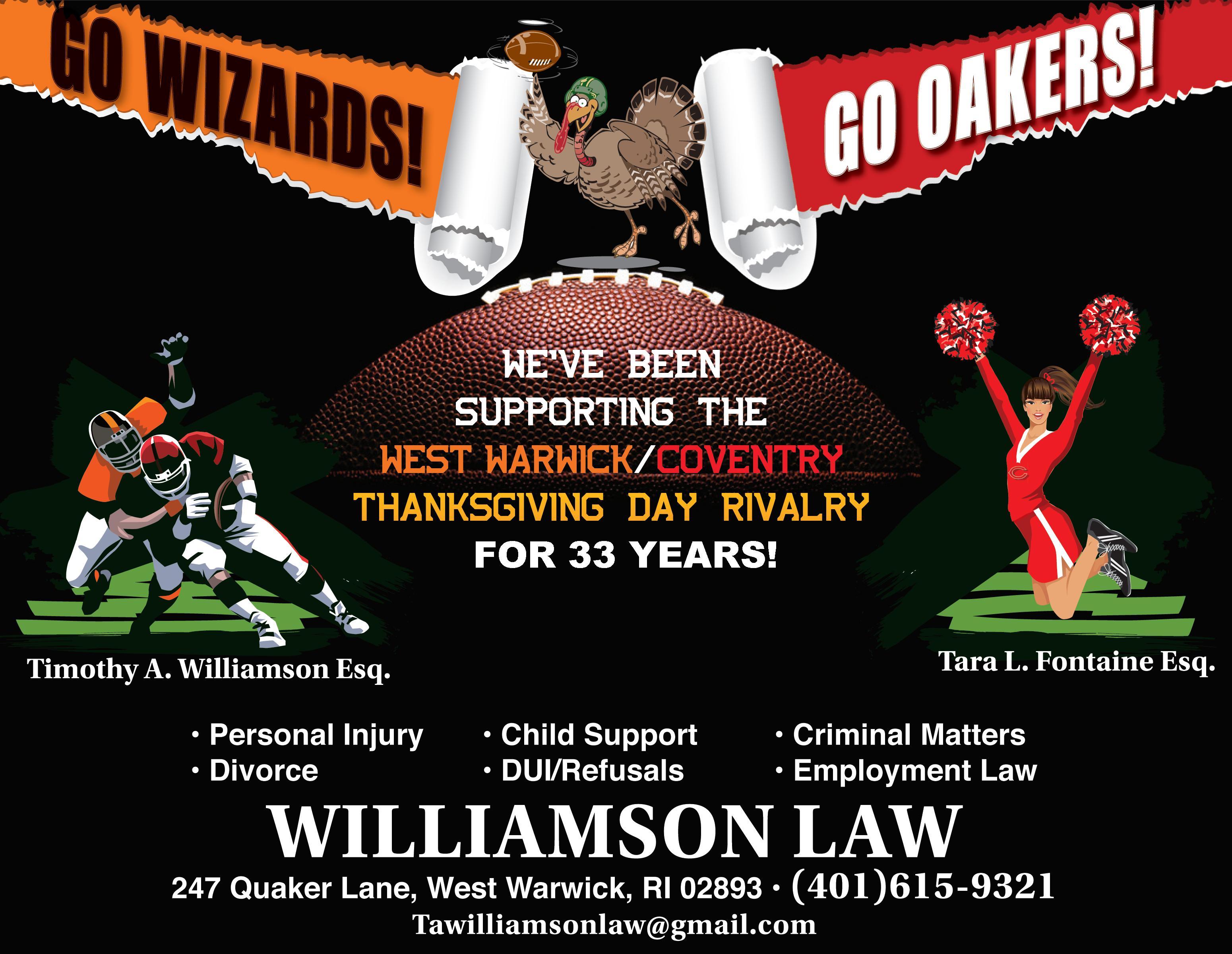 R.I.’S FIRST WEEKLY SHOPPING GUIDE REMINDER The SINCE 1954 A BEACON COMMUNICATIONS PUBLICATION 5 Coventry Shoppers Park, Coventry, Rhode Island 02816 • (401)821-2216 • www.rireminder.com November 22-28, 2022 • Volume 68 • Issue 29 PRESORT STANDARD U.S. POSTAGE PAID BRIDGEPORT, CT 06602-9644 PERMIT NO. 15 At Your Service 12 Automart 9 Business Spotlight 7 Classifieds 4 Community News 18 Entertainment 27 Home Improvement 13-15 Job Market 8 Puzzle Page 6 Reader Ad Form 4 Real Estate 9 Yard Sales 19 TURKEY BOWL B ... pgs.19-26 57 Sandy Bottom Rd., Coventry • 401-821-0300 • Call for Store Hours Your One Stop Shop for the Holidays or Join Us For Facebook Live Shopping Every Monday, Wednesday & Friday at 7pm Check our Facebook for Store Hours CAPE COD BRACLETS WILLIAMSON LAW 247 Quaker Lane, West Warwick, RI 02893 (401) 615-9321 Tawilliamsonlaw@gmail.com • Personal Injury • DUI/Refusals • Divorce • Criminal Matters • Child Support • Employment Law Timothy A. Williamson Esq. Tara L. Fontaine Esq. Give us a call today for your F FREE estimate! 401-659-5236 Leaves Starting to Fall? Give Us A Call! Leaf Cleanup & Curbside Pick up Fully Insured