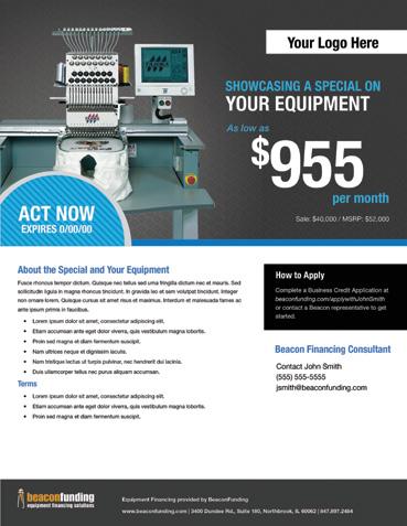 We’re pros at customizing equipment financing literature and collateral for our valued equipment vendor partners. Our custom financing and leasing literature showcases your brand, equipment, and contact information with Beacon’s competitive monthly payment.