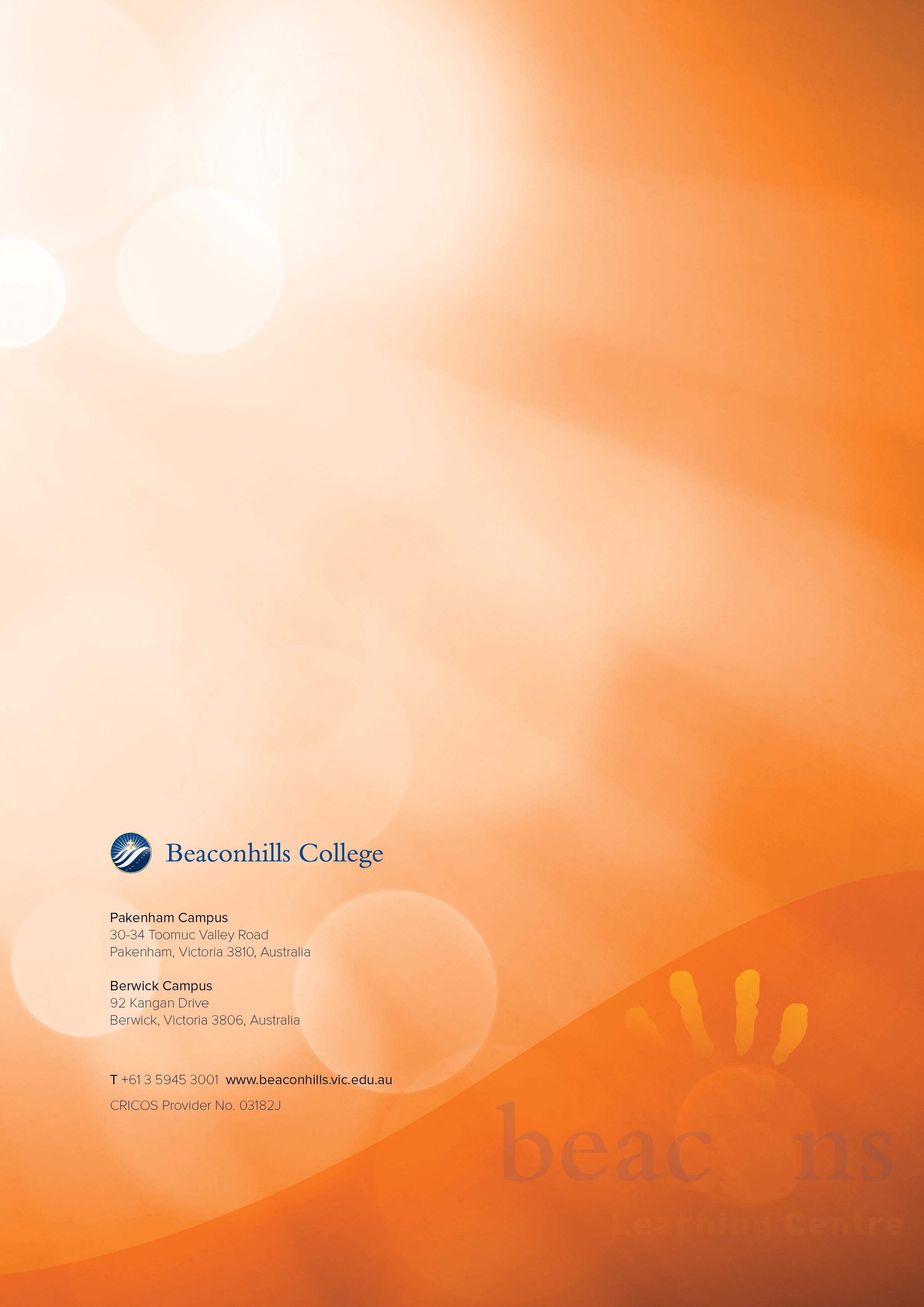 Beaconhills College acknowledges the Wurundjeri and Bunurong – Boon Wurrung peoples as the Traditional Custodians of this land on which our College is built. We honour and respect their ongoing cultural and spiritual connection with this Country which includes Traditional Custodianship of the land, waterways and skies across Australia. We honour the richness, diversity and sophistication of the cultures of First Nations peoples. We admit with sorrow the wrongs of the past that have taken place and continue into today and that sovereignty was never ceded. We pay deep respects to Elders past and present and honour the strong leadership that is evident in the emerging Elders of tomorrow. We recognise that education is the key to unlocking our understanding of Aboriginal and Torres Strait Islander Australia and seek to explore what reconciliation means at Beaconhills College by partnering together and working to build a more just and compassionate society for the traditional owners of this land.