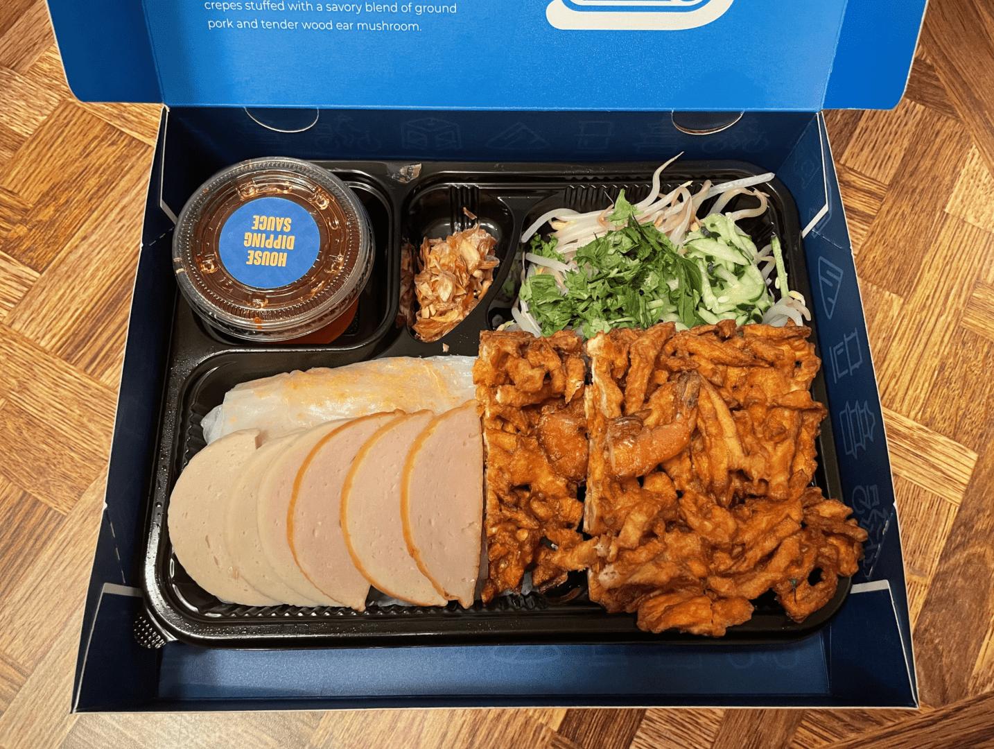 eating your bánh cuốn first if you decide to order it—don’t let it get cold! Not all of our wrappers were filled with the distinctive, earthy mixture of wood ear mushrooms and ground pork, which was a bit of a shame, as I was quite a fan. In our box, we received slightly more wrappers than there were slices of Vietnam ese pork, as well. It’s a fun, lighter, do-it-yourself kind of meal, filling your crepes to your personal preferences and satisfaction. The dipping sauce added some sweet and sour notes to the bright and savory flavors of the fillings, and only a hint of heat; nothing completely overpowered each bite (unless you didn’t spread