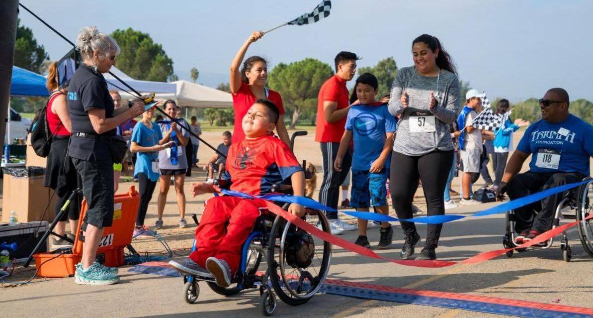 Photo of kid finishing race at a previous Pasadena Adaptive Sports Festival event. | Photo courtesy of the City of Pasadena