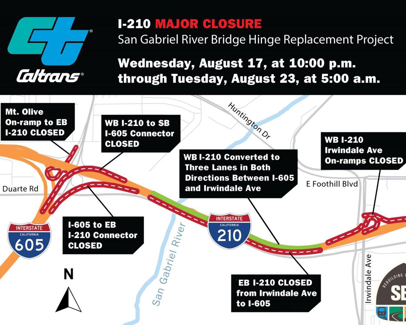 T he first round of closures occurred on the westbound side of the freeway last month, narrowing the whole freeway to just three lanes in both directions and causing commut ing delays felt across many cities other than Duarte and Irwindale, the towns nearest the I-605 on-ramp and Irwindale Avenue corridor where the construction is taking place. Expect the same snarls Other than starting an hour earlier on Aug. 17 workers are essentially on the same schedule, with construction ongoing until the planned reopening of the freeway at 5 a.m. on Aug.The23. continuing construction is in an effort to finish replacing hinges that help keep the San Gabriel River Bridge in place, while also resetting concrete, installing steel rebar and working on the concrete medians on that side. ‘We have to do it’ “The bridge essentially is 811-feet-long,” structur al manager Qunh Nguyn told ABC7. “The challenge in this project is not just the upgrade of the hinges — two hinges — hinge four and six, but we have to do it for the first time in Cali fornia.”While a full “carma geddon” didn’t neces sarily take form with the last shutdown, drivers are again encouraged to avoid the area, expect delays, and consider different solutions, like working from home or taking the MetroTheL-Line.50-year-old bridge has needed these hinge repairs for a while now to make the bridge more fit for seismic movement or “[when] there’s a big load going through the freeway. So we want that movement and that flexibility on the bridge,” Caltrans Spokes person Eric Menjivar told LAist. More upgrades The hinge and concrete repairs are a part of a $31 million earthquake retro fitting project but aren’t the only renovations the freeway will see soon. In addition to finishing what they started on the westbound side, Caltrans crew began potholing on and off ramps along the stretch of the I-210 freeway between Sunland Avenue in Sunland-Tujunga and Arroyo Blvd. in Pasadena on Aug. 11 to meet the current Americans with Disabilities Act standards. This particular project is set to continue from 8 a.m. to 4 p.m. Friday, Aug. 12 as well as Monday, Aug. 15 at the following I-210 ramps:-Eastbound on-ramp at Sunland Avenue - Westbound on/off ramps at Sunland Avenue - Westbound off-ramp at La Crescenta Avenue - Eastbound on/off ramps at Ocean View BoulevardEastbound on/off ramps at Angeles Crest HighwayEastbound off-ramp at Gould Avenue - Eastbound on-ramp at Foothill Boulevard - Westbound off-ramp at Arroyo CaltransBoulevardinsists the potholing won’t cause any ramp or freeway lane closures, though they do warn that a work truck might safely block a ramp or street lane if necessary. For live updates and more information, go to the Caltrans District 7 Twitter page. Cervanté Pope can be reached at diagroup.com.cpope@heyme