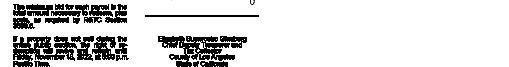 Prospective bidders should obtain detailed information of this sale from the TTC at ttc. lacounty.gov. Bidders are required to pre register at www.bid4assets.com/losange les and submit a refundable $5,000 de posit in the form of wire transfer, electronic check, cashier’s check or bankissued mon ey order at the time of registration. Regis tration will begin on Friday, September 16, 2022, at 8:00 a.m. Pacific Time and end on Tuesday, October 18, 2022, at 5:00 p.m. Pacific Time.