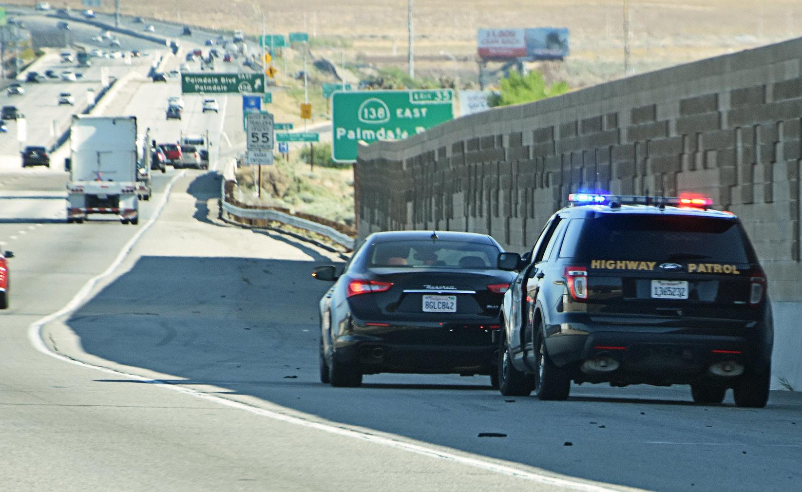 A California Highway Patrol officer pulls over a vehicle on the freeway. |