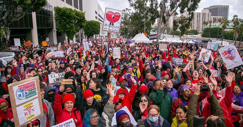 Early Tuesday afternoon, thousands of union members amassed outside LAUSD headquarters near downtown Los Angeles for another boisterous rally. The LAUSD Board of Education had previously been scheduled to meet Tuesday afternoon, but the session was canceled late Monday.