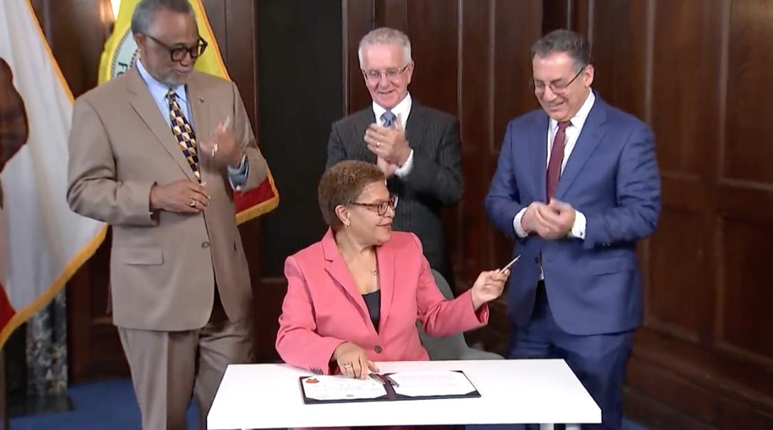 Mayor Karen Bass — joined by, from left, Councilman Curren Price, Council President Paul Krekorian and Councilman Bob Blumenfield — completes signing into effect the city’s 2023-24 budget. | Photo courtesy of MayorOfLA/Twitter
