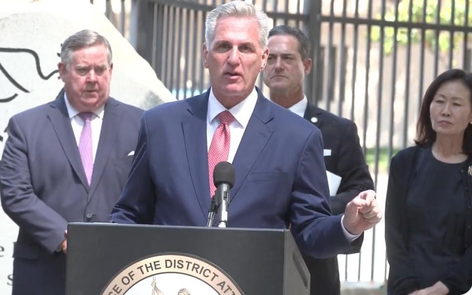 "I'm here today because of a challenge we have here in America," McCarthy said at a news conference outside the district attorney's offices. "I'm here because of an old friend I served with in the state Assembly."