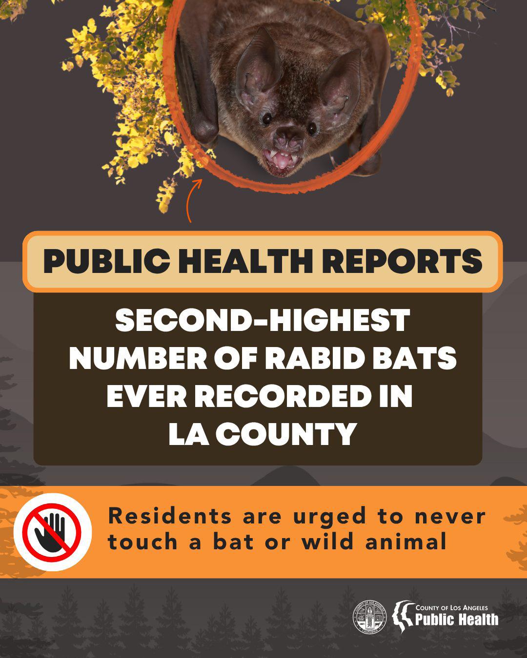 “Bats are vital to our environment, but they can also carry rabies, a disease that is almost always fatal once symptoms appear,” Los Angeles County Health Officer Dr. Muntu Davis said. “Anyone who may have had contact with a bat should