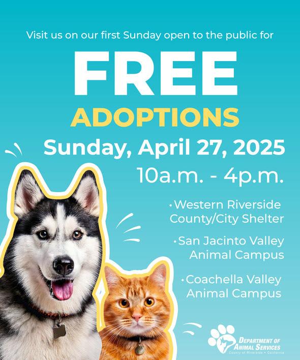 More than 1,000 dogs and over 100 cats are awaiting adoption at the Blythe Animal Shelter, San Jacinto Valley Animal Campus, Coachella Valley Animal Campus in Thousand Palms and Western Riverside County Animal Shelter in Jurupa Valley.