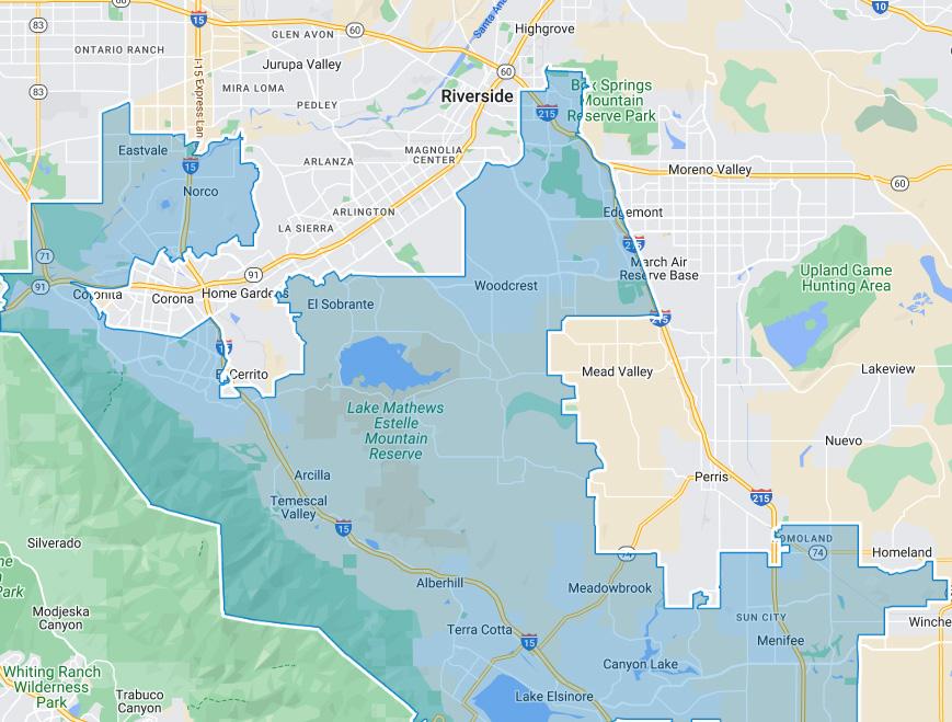 The 63rd Assembly District consists of Norco, West Corona, Temescal Valley, Lake Elsinore, Menifee, Woodcrest, south and east Riverside, Mead Valley, Meadowbrook and several surrounding communities.