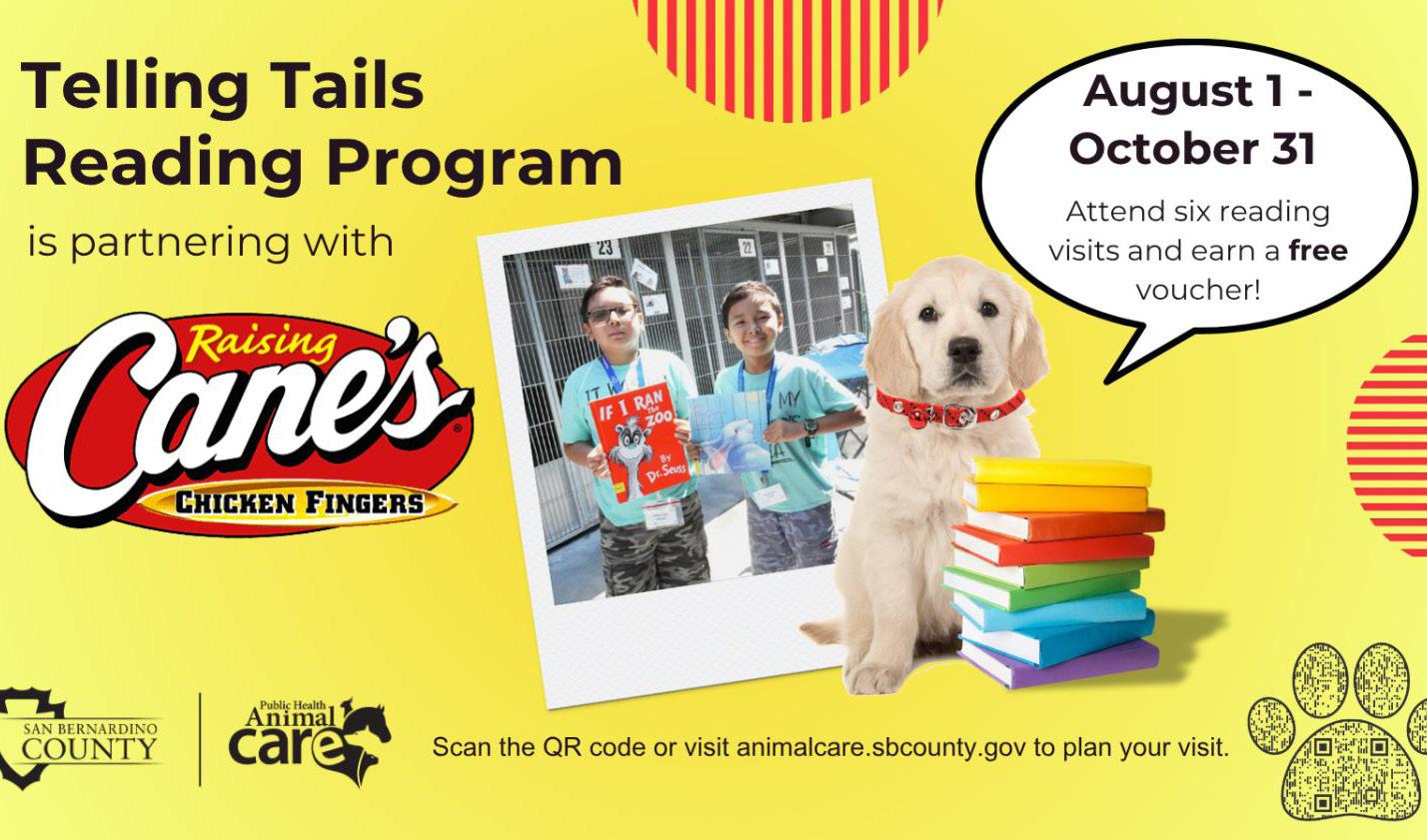 San Bernardino County Animal Care has teamed up with Raising Cane’s for a pawsitively fun twist on our “Telling Tails” Reading Program. From now until Oct. 31, kids ages 6 to 12 who complete six reading sessions with San Bernardino County Animal Care’s shelter pets will earn a free kids combo, courtesy of Raising Cane’s. Reading to shelter pets helps them feel loved and socialized—and gives kids a chance to build confidence, compassion and reading skills. It’s a tail-wagging win-win. Visit the Telling Tails Reading Program webpage (https://animalcare.sbcounty.gov/telling-tailsreading-program/) to learn more.