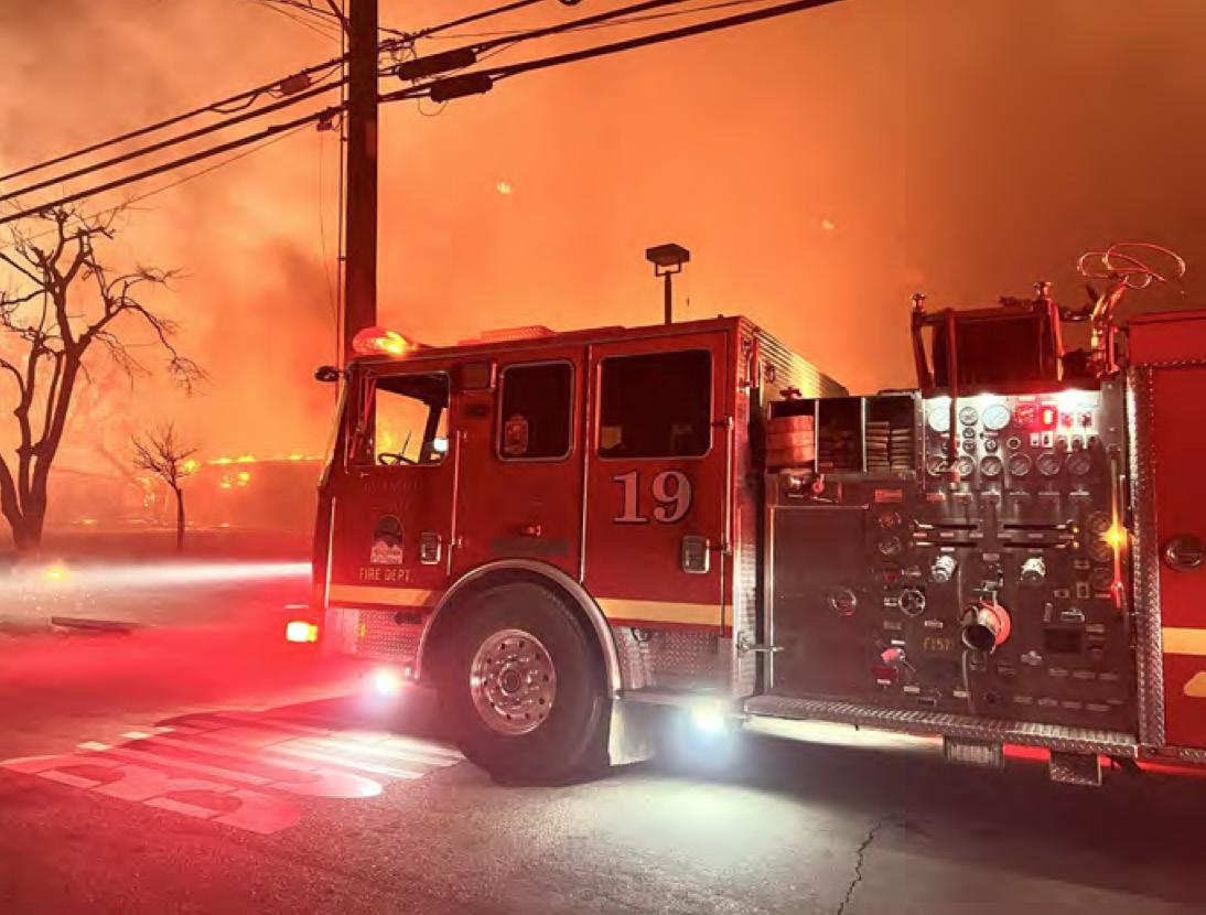 A county fire engine stations near burning structures during the January wildfires. | Photo courtesy of Los Angeles County