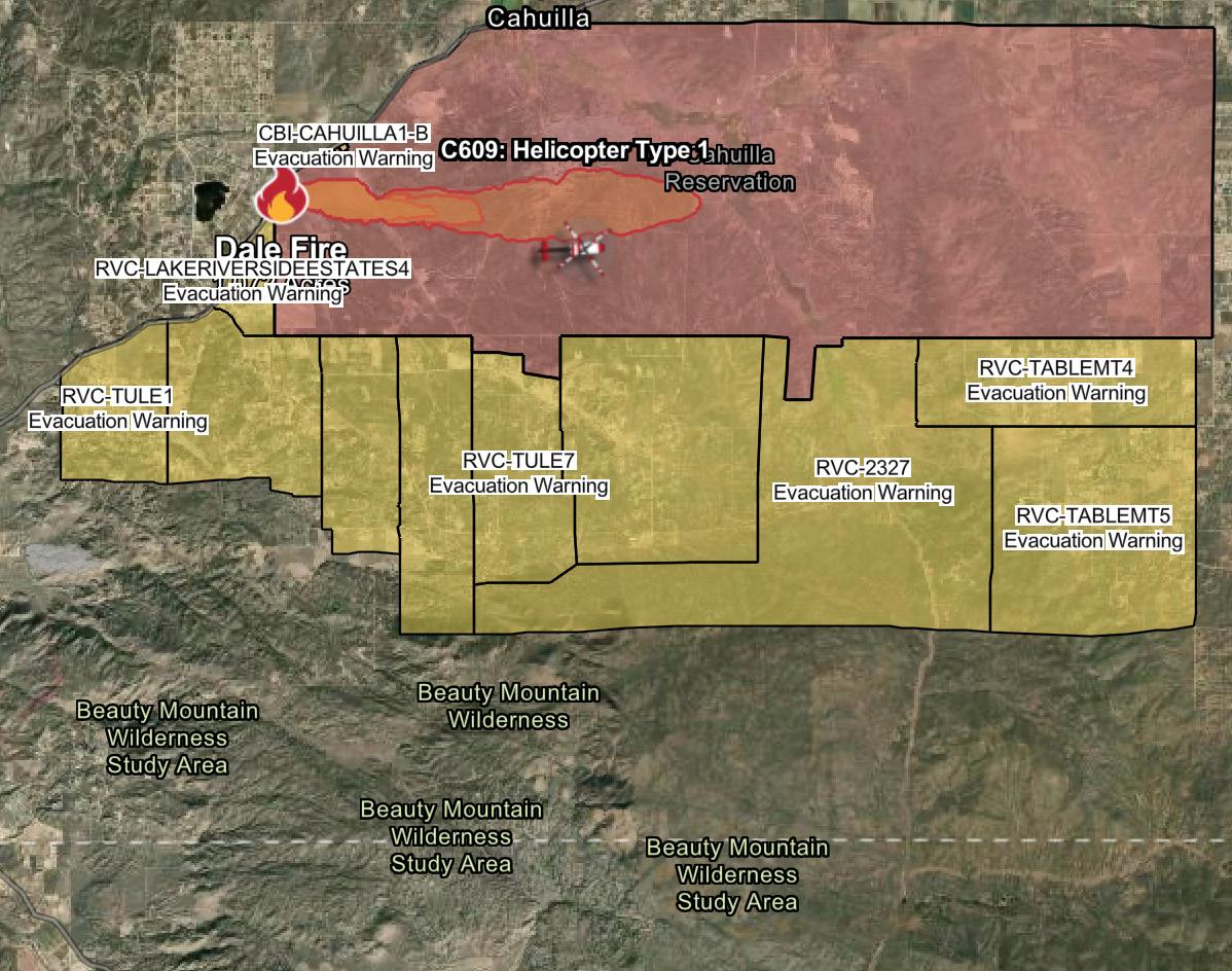 On Wednesday, seven Cal Fire air tankers and three helicopters initiated runs on the Dale Fire. The flames continued progressing toward Cahuilla Creek Motocross and the Cahuilla Casino Hotel, both south of State Route 371, east of the fire.