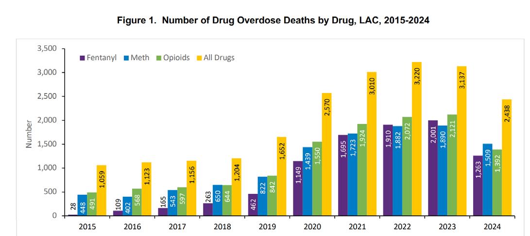 Drug-related overdose deaths in Los Angeles County fell by 22% in 2024 -- the most significant drop in the county’s history, according to a report released Wednesday by the Department of Public Health. The decrease includes a 37% drop in fentanyl-related deaths and a 20% decrease in methamphetamine-related fatalities, based on data from the county’s Department of Medical Examiner.
