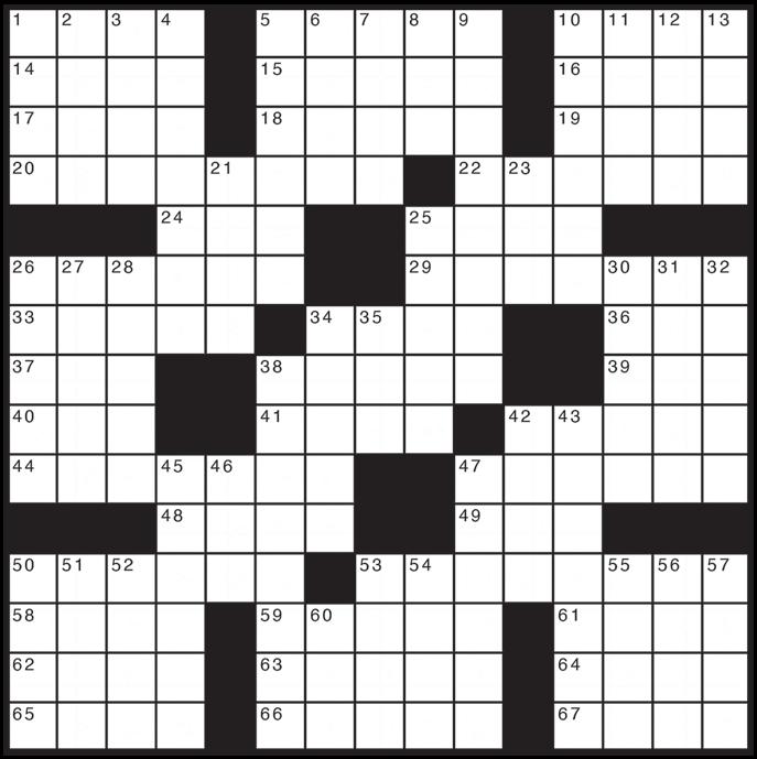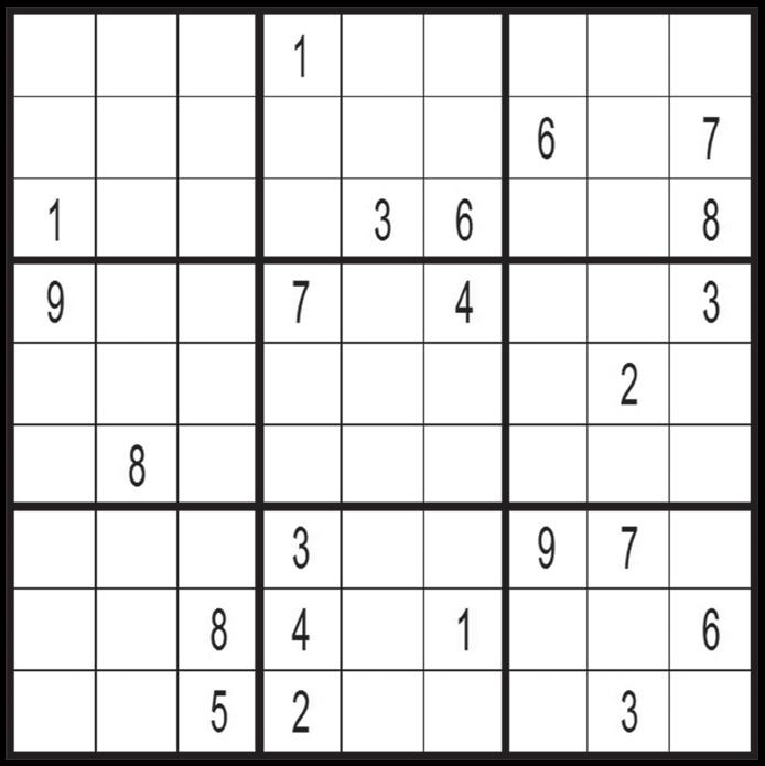 SUDOKU ACROSS 1. Buenos ___ 5. High home 10. Land east of the Urals 14. Garb for the bench 15. Poles, e.g. 16. AAA recommendations 17. “Roots” author Haley 18. Article of faith 19. Ethereal: Prefix 20. Ragged 22. Head armor 24. Attorney’s org. 25. Big rig 26. Worldly 29. Normally 33. Friendship 34. Hatcher of “Lois and Clark” 36. Neptune’s domain 37. “Silent” prez 38. Actress Phoebe 39. City in GA 40. Suffer 41. Way, way off 42. Bristles 44. Ego 47. Hotel patrons 48. Questionable 49. Bruin legend Bobby 50. Size up 53. Inflammation of bone 58. Henry VIII’s last wife 59. Thai breed of cat 61. I could ___ horse! 62. Purim’s month 63. Goodnight girl of song 64. Editor’s mark 65. Tabula ___ 66. Pitcher Ryan 67. Domesticate DOWN 1. Darn! 2. Kansas city 3. Help in a heist 4. Astronomical instrument 5. Star-shaped 6. Robt. ___ 7. Monetary unit of South Africa 8. Now ___ seen everything! 9. Sensation 10. Decorative ivy 11. Flower part 12. Able was ___... 13. ___were (so to speak) 21. Auction site 23. Outback bird 25. Less doubtful 26. Chocolate tree 27. Lower a sail 28. Lunar valley 30. Atty.-to-be exams 31. Sic on 32. Some locks 34. Chewy candy 35. Greek letter 38. Cowhide 42. Free from doubt 43. Most strange 45. Mountain range 46. Abysmal grades 47. Obtained 50. On ___ with: equal to 51. Actress Thompson 52. Ladies of Sp. 53. Baseball’s Hershiser 54. Yemen’s capital 55. Toodle-oo 56. Romantic couple 57. Fill to the gills 60. Spanish gold CROSSWORD Call Jil 719-900-7664 Advertise in WWW.LAFIFTY.COM | DECEMBER 2022 | FUN & GAMES | 43 FUN & GAMES Puzzle answers