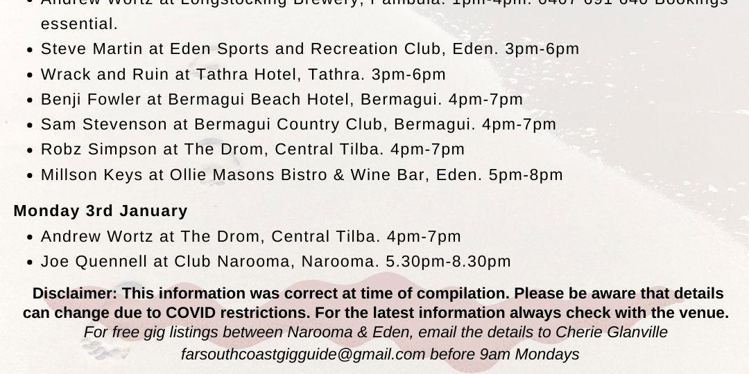 Dec 24th - Rick Bamford at the Moruya Golf Club Dec 24th - The Pearlerz at Tomakin Social Club Dec 24th - Solo West at the Batemans Bay Soldiers Club Dec 24th - Intensity Duo at Bodalla Pub Dec 24th - Salt – Club Narooma (5.30pm) Dec 26th - Ma Dent at Tomakin Social Club Dec 26th - Intensity – Club Narooma (3pm) Dec 26th - Intensity Duo at the Batemans Bay Soldiers Club Dec 27th - Intensity Duo at the Batemans Bay Soldiers Club Dec 28th - Intensity – Club Catalina (7.30pm) Dec 28th - Sirenics Duo at the Batemans Bay Soldiers Club Dec 29th - Sirenics Duo at the Batemans Bay Soldiers Club Dec 30th - Tim Pringle at the Batemans Bay Soldiers Club Dec 31st - 5051 at Club Tuross Dec 31st - Flock of Haircuts at the Batemans Bay Soldiers Club Dec 31st - Bonnie Kay and the Bonafides $20 at the Moruya Golf Club Dec 31st - Moruya Waterfront • 19-Twenty, Genevieve Chadwick and MORE!