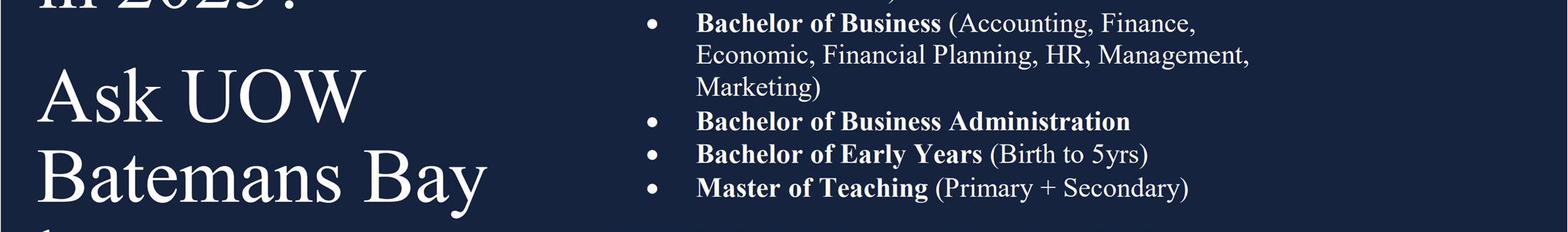 Anyone interested in joining U3A should go to the website h p://bbay.u3anet.org.au. and access the newsle er which contains the second semester program and an easy schedule indica ng the me and day of classes. The newsle er is also available in hard copy in the shire libraries. You can obtain more informa on by calling the Membership Coordinator Joe, on 0411 327 700. Alterna vely, you can a end the Shopfront which will held on 13 October from 10 – 11.30am in the Mee ng Room at the Batemans Bay Library.