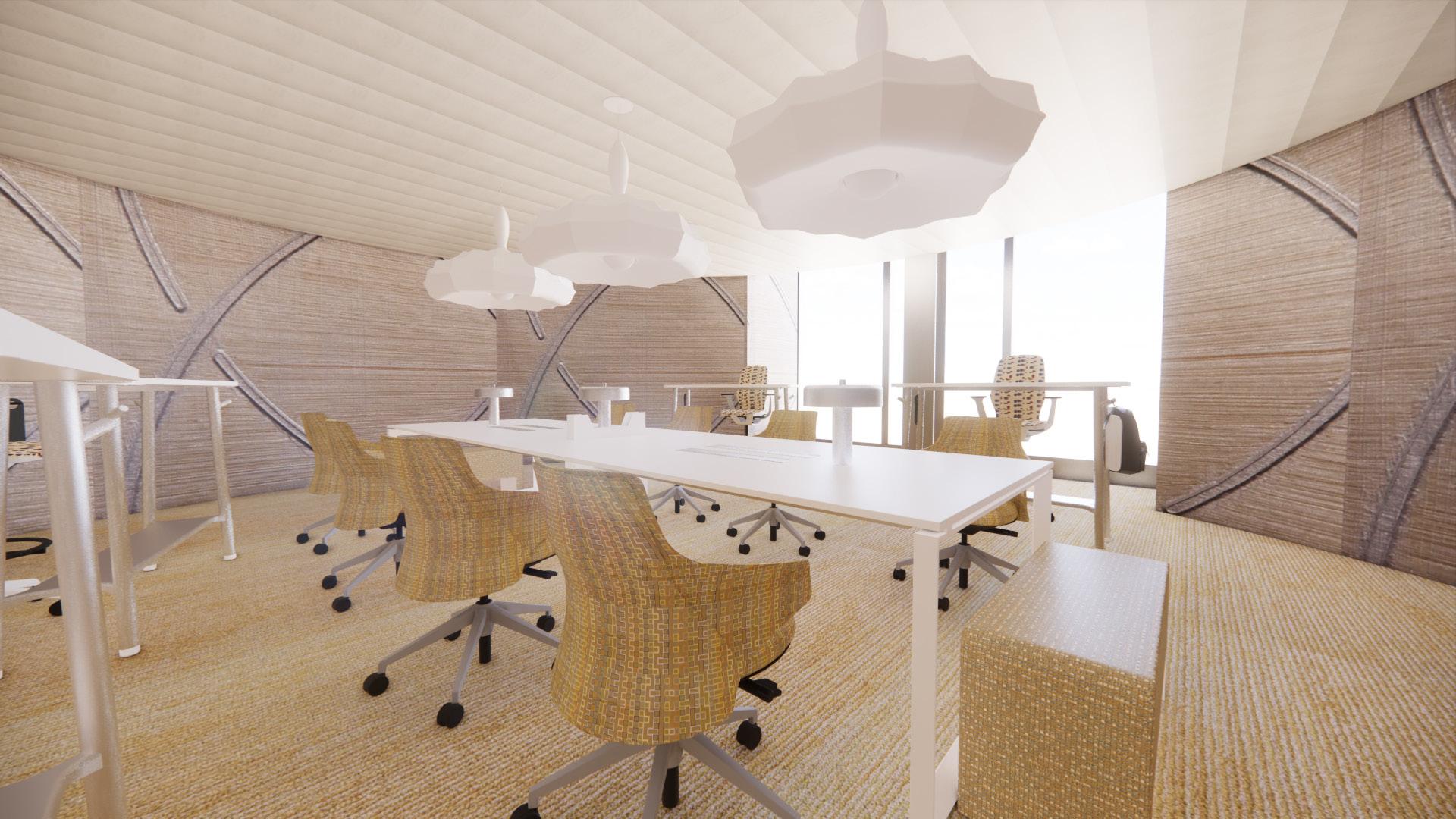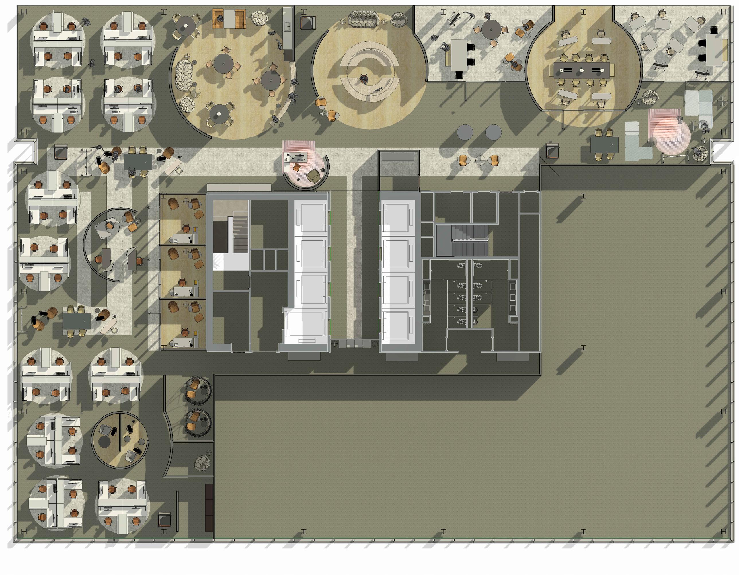 There are FIVE CORE HUBS within the space that are zoned off by spherical elements. Since SUPERSYMMETRY is a principle, these five spheres act as fundamental conceptual building blocks, allowing the rest of the spaces to FLOW radially. The spheres remain permanent, but the rest of the spaces exist in FLUX; which allows space for change and progress. The radial spaces can be rearranged to fit the company’s growing needs with the INDIVIDUALITY of the employees as the central and driving focus. Applying the the principle of supersymmetry to this space plan concludes that even as you move the radial blocks, the space remains as functional and supportive as it was before alteration.
