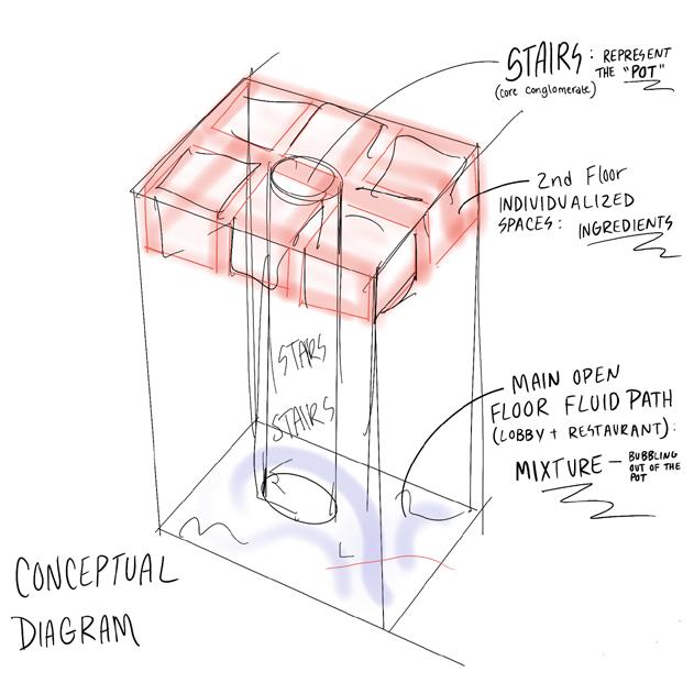 This was a group project proposal for a boutique hotel and restaurant located locally in Manhattan, Kansas. Groups were responsible for the main floor reception, lobby, restaurant, stairs, upstairs lobby, outdoor rooftop patio, and entry facade.