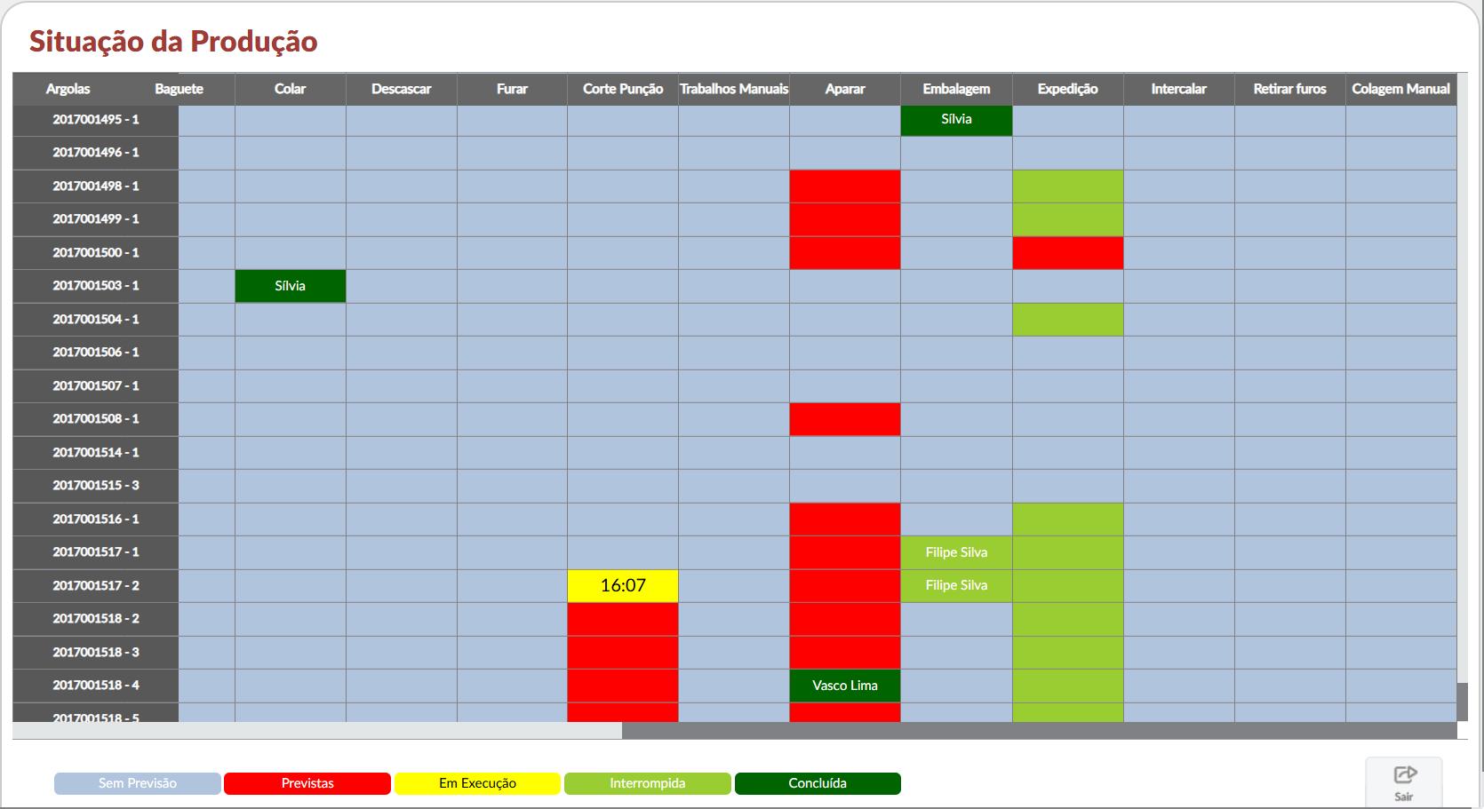 Interrompida: Caso uma tarefa seja interrompida por qualquer motivo, ela é sinalizada com a cor verde clara, permitindo identificar rapidamente qualquer atraso no processo.