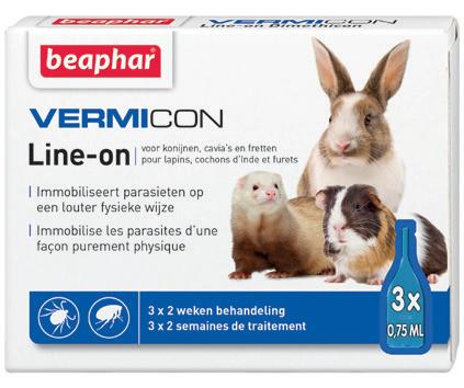 NL De Vermicon Line-On o.b.v. Dimethicon immobiliseert vlooien, teken en insecten zoals muggen, mijten, luizen, zandvliegen enz. op een louter fysieke wijze. De Line-On bevat geen chemische insecticiden. De pipetten hebben een preventieve werking van maximum 4 weken. Geschikt voor honden vanaf 12 weken.