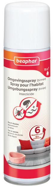 FR Le spray Beaphar pour l'habitat élimine les puces, les larves de puces et les tiques dans l'environnement de l'animal. L'effet est rapide et dure jusqu’à 6 mois. Le spray permet de traiter une surface de l’ordre de 70 m².