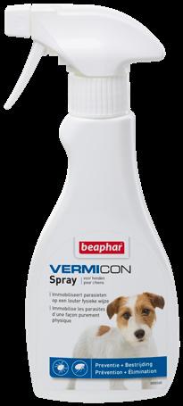 NL De Vermicon Spray o.b.v. Dimethicon immobiliseert vlooien, teken en insecten zoals muggen, mijten, luizen, zandvliegen enz. op een louter fysieke wijze. De spray bevat geen chemische insecticiden. Deze spray heeft een bestrijdende en beschermende functie.