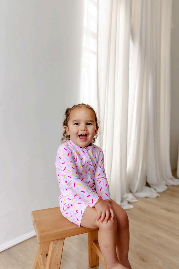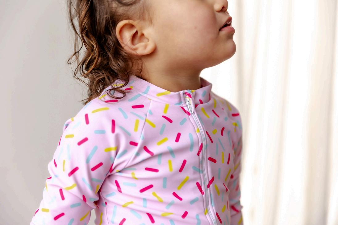 Both of the popular prints, Beach Dinos and Sprinkles, are making a comeback! This time as Emerson Swimsuits.