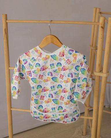 SleevedBibfeatures adjustabledomesizing, cuffedsleevesand catcherpocket.