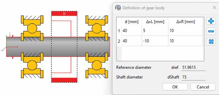 A shaft is stiffened by a gear body and the gear body geometry also affects the line load distribution in the gear contact. The two options for stiffening of the shaft by the gear are extended to five options now and can use a 3D-FEA mesh to consider