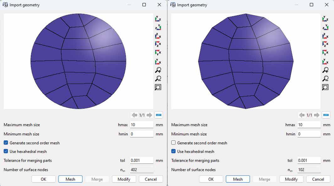 The surface mesh can be generated as a second order mesh on the CAD import now. This improves the accuracy if a second order mesh is selected for calculation afterwards. All nodes will then be on a cylinder, not only the corner nodes of the elements. The disadvantage is the increased file size. A second order mesh requires four times the size of a linear mesh. For large element sizes the outside geometry still looks like a circle instead of a polygon in case of a second order mesh generated on the import.