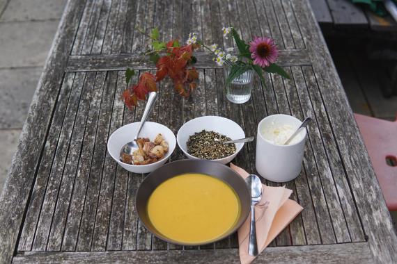 TopfvomHerdziehenunddieSuppemit demPürierstabcremigpürieren.Sojasahne einrührenunddieSuppenochmalsabschmecken.SolltedieSuppezudicksein,einfach etwasmehrSuppeoderWasserhinzufügen. SuppeaufTeller/Schalenverteilenundmit einemSchussSojasahneoderKürbiskernöl undKürbiskernengarnieren.