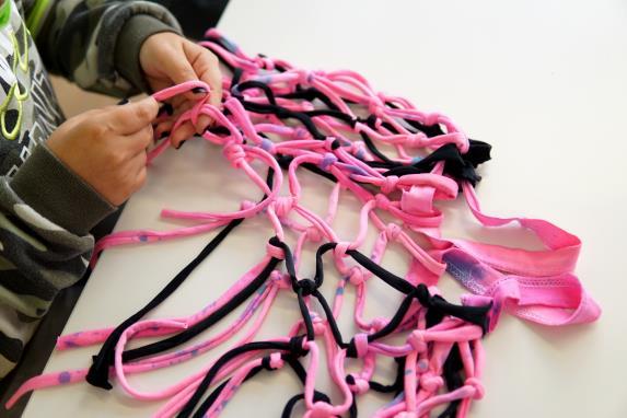 WennderTextilgarngekauftist,schneide6 Stückzuje33Zentimeterund20Stückzuje 20Zentimeterzurecht.DamitzweiRingeals Griffeentstehen,flechtedreiderkurzenStückezueinemStrangundverknotedieEnden miteinander.ZiehedieHälftevomGarn,den duentwederselbstgemachtodergekauft hast,durchdiezweiGriffringe.