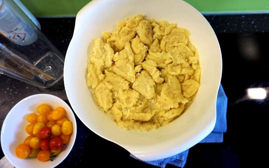 3. In einen hohen Topf gesalzenes Wasser zum Kochen bringen. Aus dem Teig mit einem Teelöffel Nockerl abstechen, ins kochende Wasser geben und für 10 bis 12 Minuten leicht köcheln lassen. Abseihen und mit kaltem Wasser abschrecken.